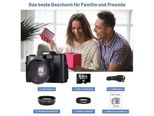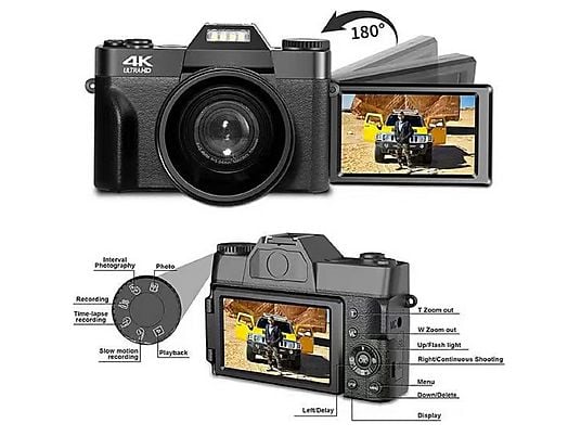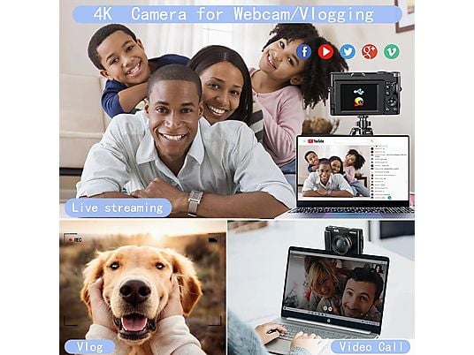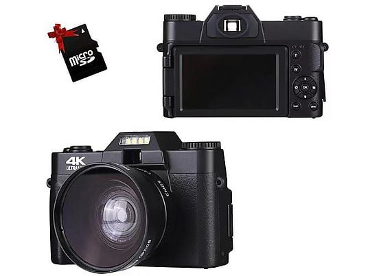 Esta cámara digital 4K con tarjeta SD cuenta con numerosas funciones, como autoenfoque, cámara web, grabación en bucle, silencio, cámara lenta, time-lapse, grabación a intervalos, aumento de brillo, flash, 5 tipos de balance de blancos y 6 tipos de filtros.