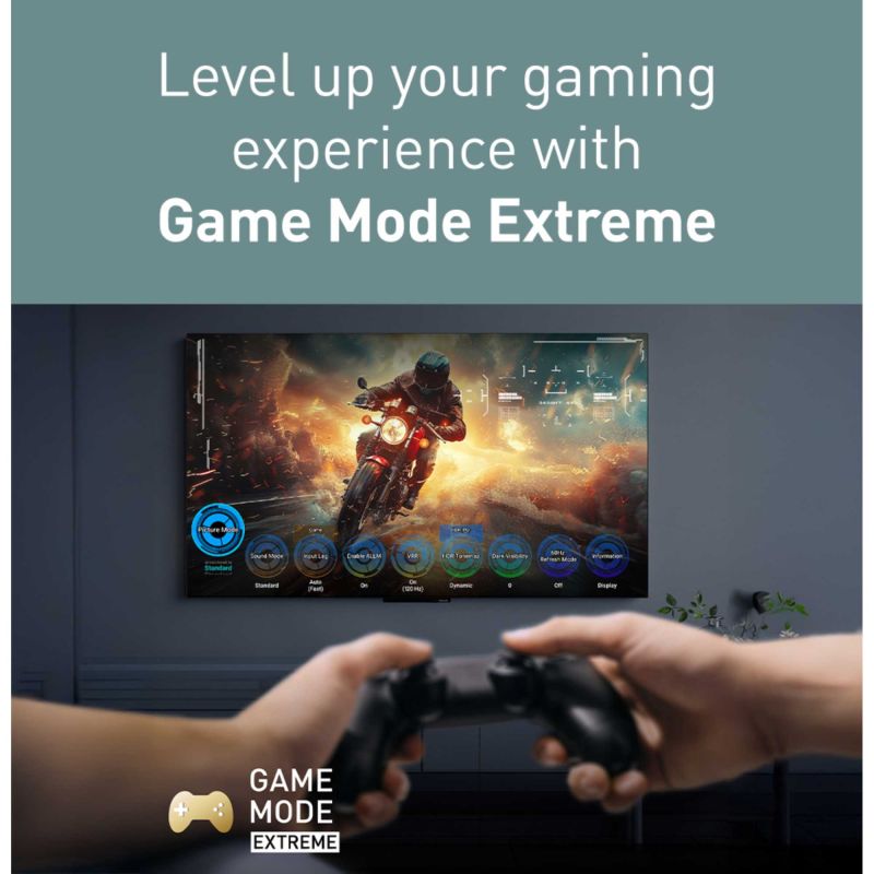 El Game Mode Extreme está diseñado para entusiastas del gaming, ofreciendo una experiencia inmersiva con rendimiento ultra sensible. Minimiza el input lag y optimiza la frecuencia de actualización del televisor, garantizando un juego fluido incluso en las escenas más rápidas. Con soporte para VRR (Variable Refresh Rate) y ALLM (Auto Low Latency Mode), el televisor se adapta en tiempo real a las demandas de los juegos modernos, reduciendo cortes de imagen y mejorando la capacidad de respuesta. Además, el color y el contraste optimizados hacen que los mundos de los juegos luzcan vivos y detallados.